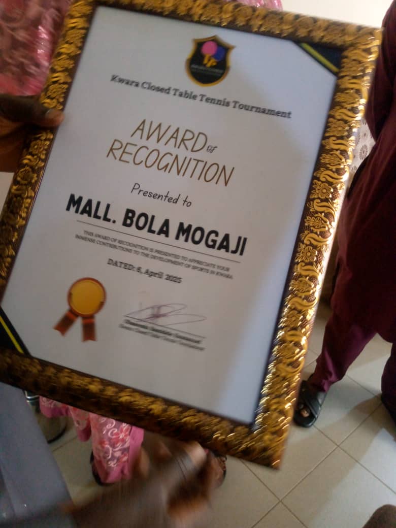 The organizers of Kwara Close Table Tennis Tournament today presented an award of Recognition to the Executive Chairman of the Kwara state Sports Commission, Coach Bola Mogaji in his office.